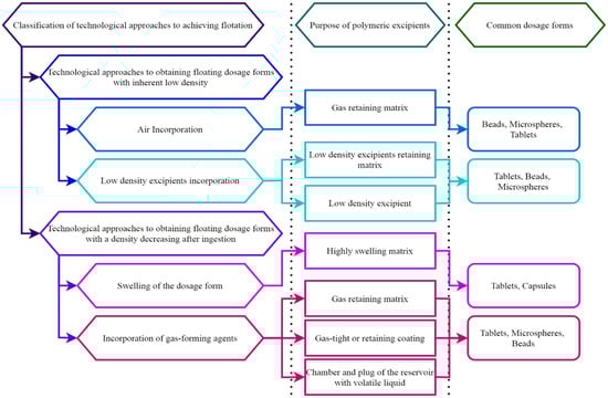 Classification of technological approaches to achieve flotation, the purpose of polymers in these approaches, and the most common dosage forms.