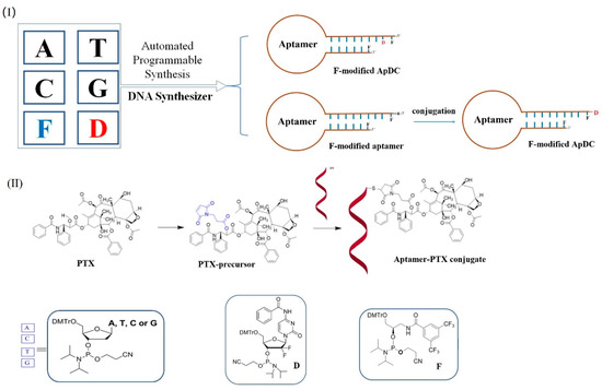 (I) Schematic illustration of automated aptamer–drug conjugate synthesis. (II) The synthesis of PTX precursor and the synthesis of ApDC by conjugation of the thiol-modified aptamer.