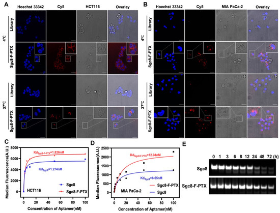 (A,B) Confocal laser scanning microscopy (CLSM) imaging of cells. HCT116 cells (A) and MIA PaCa-2 cells (B) were incubated with 500 nM cy5-labeled Sgc8-F-PTX or library at 4 °C for 30 min or at 37 °C for 1 h. The nuclei were stained with Hoechst 33342, the scale bar represents 30 μm. (C,D) Flow cytometry tests the binding affinity of aptamers. HCT116 cells (C) and MIA PaCa-2 cells (D) were incubated with 250 nM cy5-modified aptamer derivatives in a binding buffer for 30 min at 4 °C, then the fluorescence of cells was analyzed with flow cytometry. (E) PAGE gel analysis of the stability of Sgc8 and Sgc8-F-PTX. Aptamers were incubated with 10% FBS for different times and then analyzed with PAGE.