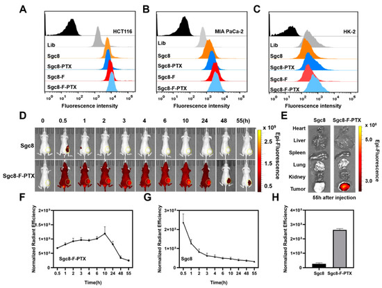 (A–C) Targeting effect of ApDC on the target cells (A, HCT116, and B, MIA PaCa-2) and control cells (C, HK-2) was analyzed with flow cytometry. Cells were incubated with 250 nM cy5-labeled oligonucleotides at 4 °C for 30 min. (D) In vivo fluorescence imaging of MIA PaCa-2 tumor-bearing mice after cy5-labeled Sgc8 or Sgc8-F-PTX were injected intravenously. The tumor sites are marked with yellow circles. (E) Ex vivo imaging of the main organs including heart, liver, spleen, lung, and kidney at 55 h post-injection. (F) The in vivo average radiant efficiency in tumor sites at different time points after cy5-labeled Sgc8 was injected intravenously, n = 3. (G) The in vivo average radiant efficiency in tumor sites at different time points after cy5-labeled Sgc8-F-PTX was injected intravenously, n = 3. (H) The quantitative result of the ex vivo fluorescence intensity in tumor site, n = 3.