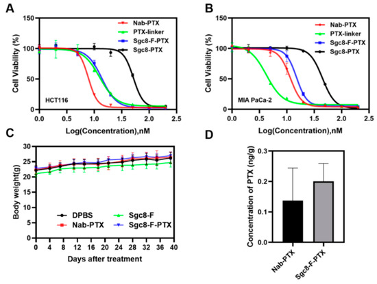 (A) Proliferation–inhibitory effects against HCT116 cells and (B) MIA PaCa-2 cells; cells were incubated with drugs at different concentrations for 72 h and analyzed with CCK-8 assay, and data were presented as the means ± standard deviation, n = 3. (C) Body weight of MIA PaCa-2 tumor-bearing mice with different treatments. (D) PTX concentration analysis of Nab-PTX- or Sgc8-F-PTX-treated mice; PTX was extracted from the tumor tissue and analyzed with UPLC-ESI-MS/MS.