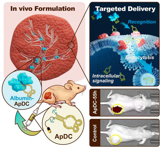 Chemotherapy is one of the major types of cancer treatments that uses anticancer drugs [1]. Due to severe side effects caused by chemotherapeutics, targeted drug delivery has been extensively explored during the last decades [2]. The conjugates of drugs with targeted ligands can enhance the efficacy and decrease the nonspecific toxicity of drugs, as illustrated by several approved antibody–drug conjugates (ADCs) [3]. Aptamers are single-stranded oligonucleotides selected through SELEX technology, which can specifically recognize and bind to their targets with high affinity [4,5,6]. It has been demonstrated that aptamer–drug conjugates (ApDCs) are a potential targeted drug delivery system for cancer therapy, which are constructed through a chemical approach [7,8,9,10,11,12].