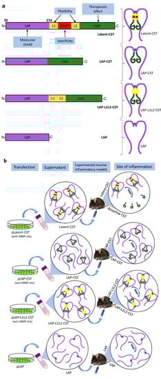 Although cortistatin has proved to be an effective and safe therapy in many preclinical models of disease [5,12,13,14,15,16,17,18,19,20], and even in the treatment of human disorders [21,22], it faces with two drawbacks that could impair its translation into clinical practice in a medium-time period. First, as occurs with other neuropeptides, due to its rapid degradation by endopeptidases, cortistatin has a short half-life in body fluids and tissues (approximately 2 min in plasma) [23], which implies repetitive administrations of high doses of the peptide to reach optimal effects in vivo. Second, with the promiscuity of cortistatin for several binding sites that are expressed in a variety of cells in multiple locations in the body, the risk of generating pleiotropic and undesired side effects after its injection arises. In order to increase the half-life of the peptide, several strategies have been previously proposed and assayed for other immunomodulatory peptides, like vasoactive intestinal peptide (VIP) or melanocyte-stimulating hormone (MSH), including residue substitutions and cyclic-structures in the molecule for improving its stability, encapsulation in nanoparticles or micelles, or the use of viral vectors for increasing its protection [24,25,26,27,28]. In this sense, we recently generated a stable analogue of cortistatin by selective amino acid substitutions of the naïve peptide that showed more than ten-fold higher half-life in plasma and similar therapeutic effects compared to cortistatin in experimental chronic IBD [23]. While these strategies significantly solve the problem of reduced stability, they do not avoid the potential emergence of undesired side effects. This issue has received attention lately after recent findings suggesting that increased activity of the cortistatin-MrgX2 system could be associated with itch and chronic prurigo in humans [29,30]. Therefore, the design of a cortistatin-based compound that acts as a prodrug, which protects cortistatin from peptidase-induced degradation and specifically releases the bioactive peptide at the target site, is desirable. In this sense, Adams and collaborators in 2003 designed by molecular engineering a latent form of the cytokine interferon-β [31] that was later adapted to VIP and MSH [32] to demonstrate in vivo their increased efficiency for the treatment of experimental inflammatory disorders. Following this strategy, in this study, we have designed a latent form of cortistatin that consists of a molecular shield provided by the latency-associated peptide (LAP) of the transforming growth factor-β1 (TGF-β1) linked to the sequence of cortistatin by a cleavage site of recognition by metalloproteinases (MMP) (Figure 1a), in which LAP protects cortistatin from degradation by tissue endopeptidases once injected and avoids its binding to receptors and the MMP-cleavage site by allowing the release of the bioactive cortistatin only in places in the body where these enzymes are abundant, like foci of inflammation or fibrosis (Figure 1b). The efficiency of this new latent form of cortistatin with potential increased bioavailability was assayed in various experimental models of inflammatory and fibrotic disorders.