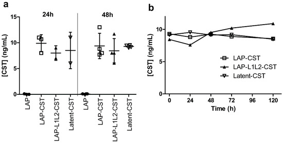 To evaluate the stability of cortistatin in the different forms, supernatants collected at 48 h from cultures of HEK293 cells that were transfected with pLatent-CST, pLAP-L1L2-CST, or pLAP-CST were incubated for 24 h, 48 h, 72 h, and 120 h in 20% bovine serum-supplemented complete DMEM medium at 37 °C, and the content of cortistatin was determined by ELISA at the indicated time points (Figure 2b).