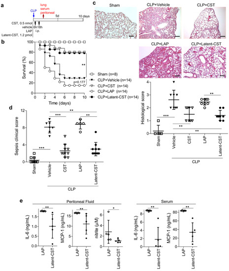 We initially evaluated the therapeutic potential of the newly generated latent form of cortistatin in experimental polymicrobial peritonitis, which is widely considered as a reliable preclinical model of human sepsis and in which cortistatin was previously reported to exert a therapeutic effect [16,39]. In untreated mice, ligation and puncture of the cecum caused a mortality rate around 75% (Figure 3b) due to disseminated intravascular coagulation with multiple organ failure, as indicated by severe congestion, hemorrhage, fibrin deposits, edema, thrombosis, and massive accumulation of leukocytes in lungs (Figure 2c) and other target organs (not shown). This pathology is a consequence of the inflammatory response against intestinal bacteria that systemically disseminated once they colonized the peritoneal cavity. As expected, i.p. treatment with Latent-CST, at 6 h and 18 h hours after CLP induction (see scheme in Figure 3a), attenuated clinical manifestations of sepsis, such as lethargy, diarrhea, body weight loss, and hypothermia (Figure 3d) and significantly improved survival (Figure 3b) by reducing the histopathological signs that are characteristics of this disorder (Figure 3c). In contrast, injection of LAP failed to show any therapeutic effects in septic animals (Figure 3b,c). As previously reported [16,23], treatment with naïve cortistatin showed similar protective actions in CLP-induced sepsis, although at a dose 400-fold higher than that observed for the latent form (Figure 3b,c). Similar to naïve cortistatin [39], treatment with Latent-CST reduced the production of a panel of inflammatory and oxidative mediators at the local and systemic levels (Figure 3e). Interestingly, two single injections of the prodrug were enough to induce long-lasting protective effects.