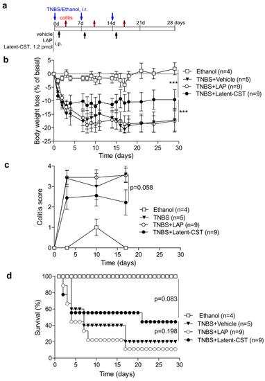 Treatment with Latent-CST protected from chronic inflammatory bowel disease (IBD). (a) Chronic colitis was induced by repetitive intrarectal (i.r.) administrations of trinitrobencene sulfonic acid (TNBS) in 50% ethanol and treated with LAP or Latent-CST as described in the scheme. Animals injected with 50% ethanol were used as basal controls of reference. Clinical evolution and disease severity was monitored by measuring body weight changes (b), colitis score (c), and survival rate (d) at the indicated time points. n = 4–9 mice/group. Repeated measures ANOVA test (p < 0.001) and post-hoc Bonferroni’s test (*** p < 0.001) in panel b. Non-parametric repeated measures ANOVA-Friedman test (p < 0.05) between all groups in panel c (p-value in the figure corresponds to the comparison between LAP and Latent-CST groups using Wilcoxon matched-pair signed-rank test). Kaplan–Meier log-rank test in panel d. Results show the mean ± SEM.