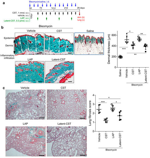 The following supporting information can be downloaded at: https://www.mdpi.com/article/10.3390/pharmaceutics14122785/s1. Supplementary Figure S1: Histological sections of skin biopsies from mice with bleomycin-induced dermal fibrosis that were s.c. treated with vehicle or latent-CST; Supplementary Figure S2: Histological sections of lung biopsies from mice with bleomycin-induced dermal fibrosis that were s.c. treated with vehicle or latent-CST; Supplementary Figure S3: Histological sections of lung biopsies from mice with bleomycin-induced pulmonary fibrosis that were i.n. treated with vehicle or latent-CST.