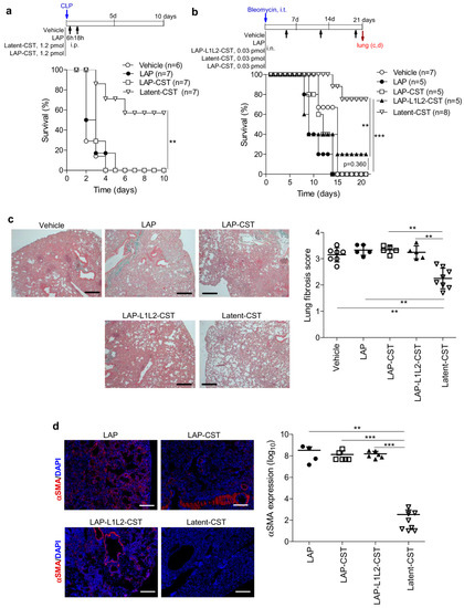 The MMP-cleavage site is essential for Latent-CST to ameliorate inflammation and fibrosis. (a) Severe sepsis was induced in mice by CLP and treated with vehicle, LAP, Latent-CST, or LAP-CST as indicated in the scheme, and survival was monitored daily (n = 6–7 mice per group; ** p < 0.01 versus LAP-treated mice using Kaplan–Meier log-rank test). (b–d) Severe pulmonary fibrosis was induced in mice by intratracheal (i.t.) injection of bleomycin and then i.n. treated with vehicle, LAP, LAP-CST, LAP-L1L2-CST, or Latent-CST as indicated in the scheme. (b) Mortality (5–8 mice per group; ** p < 0.01 and *** p < 0.001 versus LAP-treated mice using Kaplan–Meier log-rank test) was monitored daily. (c) Pulmonary fibrosis was scored by quantifying the histopathological signs in Masson’s trichrome-stained sections (scale bars: 200 µm) of lungs collected at day 21 (Latent-CST-treated group) or immediately after mice die (all experimental groups). See Supplementary Figure S3 for histopathological details using vehicle and Latent-CST-treated mice as examples. n = 5–8 mice per group, one-way ANOVA Kruskal–Wallis test (p < 0.01) and post-hoc Dunn’s multiple comparisons, ** p < 0.01. (d) The immunofluorescence analysis of α-smooth muscle actin (αSMA)-positive (red) myofibroblasts in lung sections (scale bars: 100 µm) collected at day 21 (Latent-CST-treated group) or immediately after mice die (all experimental groups) was used for quantifying fibrosis markers (data show fluorescence units expressed as log10). n = 5–8 mice per group, one-way ANOVA (p < 0.001) and post-hoc Bonferroni test, ** p < 0.01 and *** p < 0.001. Results show the mean ± SD with dots representing individual values of biologically independent animals.