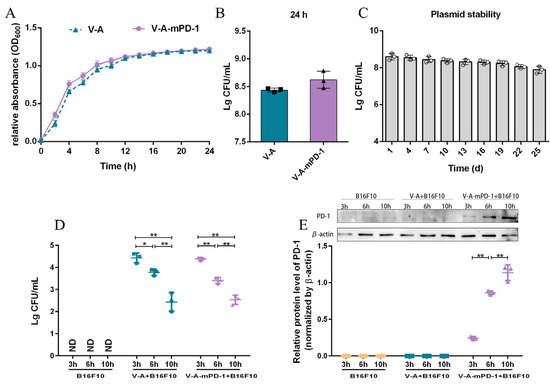Evaluation of V-A-mPD-1 in vitro. (A) Growth curves of V-A and V-A-mPD-1. (B) The number of viable bacteria corresponding to 24 h incubation with V-A and V-A-mPD-1. (C) Plasmid stability test of V-A-mPD-1. (D) The quantity of the living bacteria in the B16F10 group, V-A+B16F10 group and V-A-mPD-1+B16F10 group at 3 h, 6 h and 10 h. (E) The expression levels of the mPD-1 protein in the B16F10 group, V-A+B16F10 group and V-A-mPD-1+B16F10 group were detected by Western blotting at 3 h, 6 h, and 10 h. V-A, VNP20009-Abvec-Igκ; V-A-mPD-1, VNP20009-Abvec-Igκ-mPD-1. Two-tailed t-test for A and B, one-way ANOVA (C) or two-way ANOVA (D,E) and Tukey’s multiple comparison. Values are presented as means ± SD (n = 3). * p < 0.05; ** p < 0.01.