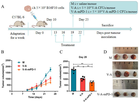 Inhibition of tumor growth in mice melanoma model by the anti-tumor effect of the V-A-mPD-1 strain. (A) Treatment schedule for mice bearing B16F10 melanoma models. (B) Changes in tumor volume over time in M, V-A, V-A-mPD-1 group. (C) Tumor size of mice in each group at day 25. (D) Images of tumor in M, V-A, V-A-mPD-1 group at day 25. M group, the melanoma mice were treated with sterilized saline; V-A group, the melanoma mice were intraperitoneally injected with VNP20009-Abvec-Igκ strain; V-A-mPD-1 group, the melanoma mice were given VNP20009-Abvec-Igκ-mPD-1 strain. Two-way ANOVA and Tukey’s multiple comparison for B and C. Data are presented as means ± SD (n = 6). ** p < 0.01.