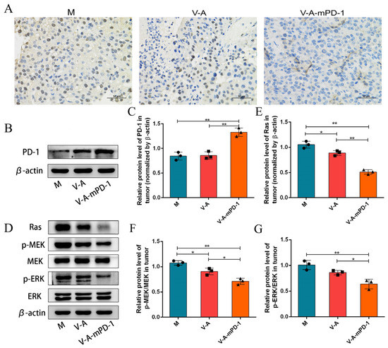 For the evaluation of the anti-tumor effect of V-A-mPD-1, we performed immunohistochemical assays, and the outcomes revealed that the V-A-mPD-1 strain markedly inhibited tumor cell proliferation by suppressing the expression of proliferating cell nuclear antigen (PCNA) (Figure 3A). Then, we examined the levels of PD-1 expressed in the tumors of each group of mice. As shown in Figure 3B,C, the PD-1 protein levels were substantially up-regulated in the V-A-mPD-1 group compared to the M and V-A groups (V-A-mPD-1 vs. M, 1.33 vs. 0.8456, p < 0.01, V-A-mPD-1 vs. V-A, 1.33 vs. 0.8579, p < 0.01). In addition, we determined the related proteins in the tumor proliferation signaling pathway Ras/Raf/MEK/ERK by Western blotting analysis, which is particularly activated in melanoma by BRAF mutation B-RafV600E/K. The results of the study showed that compared to the M group, the expression of Ras (0.8865, 0.5095, respectively), p-MEK/MEK (0.9066, 0.7104, respectively), and p-ERK/ERK (0.8612, 0.6403, respectively) were significantly down-regulated in the V-A and V-A-mPD-1 groups (except for p-ERK/ERK in the V-A group), and the down-regulation trend was more obvious in the V-A-mPD-1 group in particular (Figure 3D–G). All these results suggest that the inhibition of tumor cell proliferation may be mediated by the presence of PD-1.