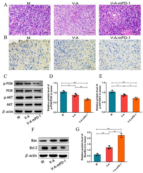 V-A-mPD-1 exerts tumor-killing effects by inducing apoptosis. (A) H&E staining images of tumor tissues (400×); (B) Immunohistochemistry of VEGF expression was determined in melanoma tumors (400×); (C) p-PI3K, PI3K, p-AKT and AKT expressions were analyzed using Western blotting on the tumors; Relative expressions of (D) p-PI3K, PI3K and (E) p-AKT, AKT in (C); (F,G) Relative expression of Bax/Bcl-2 was analyzed by Western blotting in tumors. M, the melanoma model group; V-A, the V-A treatment group; V-A-mPD-1, the V-A-mPD-1 treatment group. One-way ANOVA and Tukey’s multiple comparison for D, E, and G. Data are presented as means ± SD (n = 3). * p < 0.05, ** p < 0.01.