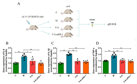 V-A-mPD-1 has the potential to reduce systemic inflammation in melanoma mice. (A) The experimental scheme of q-PCR. (B–D) Pro-inflammatory cytokines IL-6, IL-1β, and TNF-α were detected in serum at the gene level by q-PCR. C, The normal control group; M, the melanoma model group; V-A, the V-A treatment group; V-A-mPD-1, the V-A-mPD-1 treatment group. One-way ANOVA and Tukey’s multiple comparison for B–D. Data are presented as means ± SD (n = 6). * p < 0.05, ** p < 0.01.