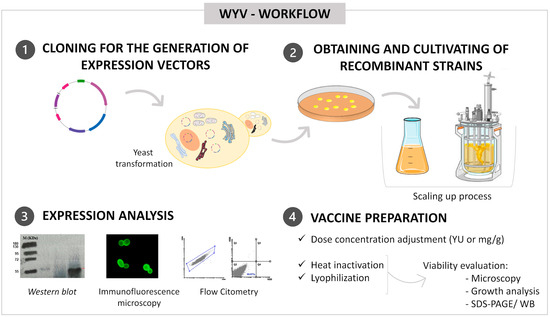 In the process of preparing and standardizing doses, it is important to include the verification of protein levels present in the yeast cell suspension after heat treatment. This evaluation can be performed through SDS-PAGE and western blot, as executed by Arnould et al. 2012 who observed that the recombinant protein remained intact after the inactivation procedures [32]. Similarly, Kumar and Kharbikar (2021) observed that the protein levels remained stable through freeze (−80 °C)/thaw cycles and lyophilization [33]. Further studies should evaluate how long WYVs can be stored without losing stability and efficiency, and which temperatures can be adopted.