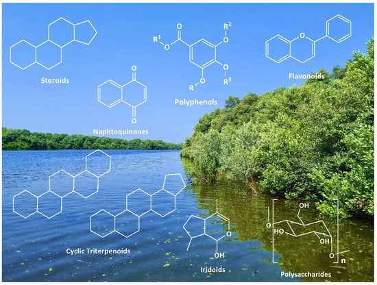 Main classes of compounds extractable from Avicennia marina: cyclic triterpenoids, flavonoids, iridoids, naphtaquinones, polyphenols, polysaccharides, and steroids. The picture was taken in the Al Zorah mangrove lagoon (Ajman, UAE).