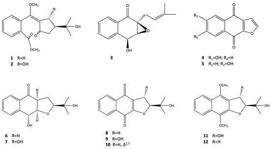 For the first time, Han et al. [18] reported the occurrence of seven unusual naphthoquinone derivatives isolated from the twigs of A. marina collected in Xiamen, called avicennone A–G (1–7), together with the known compounds, namely stenocarproquinone B (8), avicequinone A (9), avicenol A (11), and avicenol C (12). Compounds 8–10, containing 4,9-dione group as the main substituent and a mixture of compounds 4 and 5, showed high antiproliferative and moderate cytotoxic effects, as well as antibacterial activities. The structures of naphthalene derivatives 1–12, derived from A. marina, are displayed in Figure 2.