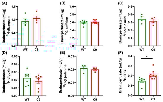 The brain-to-perfusate ratio of probe molecules in 145–150 day old female WT and C9 mice, with (A) 3H-diazepam to assess lipophilic passive diffusion, (B) 14C-caffeine to assess hydrophilic passive diffusion, (C) 3H-oleic acid to assess fatty acid transport processes, (D) 3H-digoxin to assess P-gp function, (E) 14C-(L)-alanine to assess the transport of a neutral amino acid, and (F) 3H-2DG to assess the function of Glut1. Data are presented as mean ± SEM (n = 4–8 mice per genotype), with * p < 0.05 using an unpaired Student’s t-test.