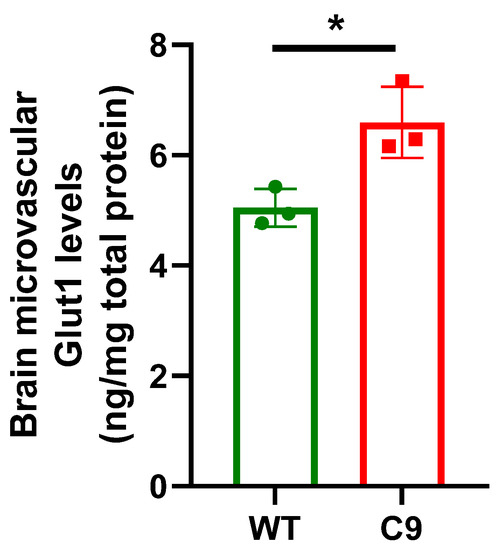 3.1. BBB Transport of 3H-2DG Was Increased in C9 Mice Relative to WT Mice, in Association with Increased Brain Microvascular Glut1 Abundance