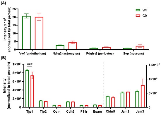 Further characterization of the BBB was undertaken by comparing the abundance of Tjp1, Tjp2, Cldn5, Ocln, Cdh5, Jam2, Jam3, F11r and Esam (Figure 3B). A two-way ANOVA with repeated measures revealed an interaction effect between genotype and proteins of interest (F8,63 = 2.108, p = 0.048), and the post hoc Sidak’s multiple comparison test demonstrated a significant (14.3 ± 9.4%, adjusted p value = 0.0003) reduction in zonula occludens-1 abundance in C9 BMECs compared to WT BMECs. In addition, a total number of 18 ABC transporters and 83 SLC transporters were identified in BMECs. Table 1 summarizes the relative intensity of the most important membrane transporters for drug and endogenous molecule disposition [29]. Of note, a significant increase in Abc9, Eaat2, Asct2, Fatp1 and a significant decrease in Bsep and Taut were observed, which are important transporters for the disposition of endogenous molecules.