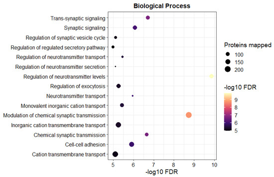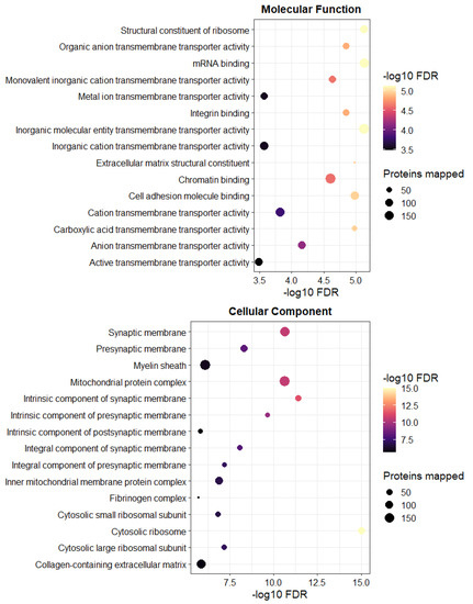 As per differential expression analysis, for all detected proteins, a total of 13 significantly differentially abundant proteins were identified, with 10 proteins exhibiting a >1.5 fold-change (Table 2). The volcano plot and heat map of significantly differentially abundant proteins are available in Supplementary Figures S1 and S2. STRING was used to perform functional enrichment analysis for all identified proteins irrespective of whether they were significantly regulated. Here, we provided some examples of the Biological Process (BP), Molecular Function (MF), and Cellular Component (CC) relevant to BBB transport highlighted by the analysis (Figure 4). When comparing WT with C9 BMECs, the BP was enriched with positive regulation of monovalent inorganic cation transport (GO:0015672), regulation of exocytosis (GO:0017157), and cation transmembrane transport (GO:0098655); the MF was enriched with negative regulation of organic anion transmembrane transporter activity (GO:0008514), and inorganic molecular entity transmembrane transporter activity (GO:0015077), but positive regulation of monovalent inorganic cation transmembrane transporter activity (GO:0015077); and the CC was enriched with positive regulation of mitochondrial protein complex (GO:0098798), and collagen-containing extracellular matrix (GO:0062023). We also performed KEGG analysis, where extracellular matrix organization (MMU-1474244; positive regulation), SLC-mediated transmembrane transport (MMU-425407; both positive and negative regulation), the citric acid cycle and respiratory electron transport (MMU-1428517; positive regulation), oxidative phosphorylation (MMU-00190; positive regulation), and drug metabolism—cytochrome P450 (MMU-00982; negative regulation) were highlighted. The complete results of the functional enrichment analysis are available in Supplementary Materials Spreadsheet S2: Functional enrichment analysis.