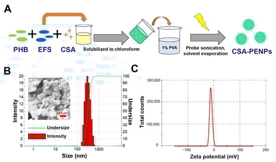 Fabrication of CSA-PENPs. (A) Schematic diagram for CSA-PENPs fabrication. (B) Hydrodynamic particle size distribution and representative SEM image of CSA-PENPs. (C) Zeta potential distribution of CSA-PENPs in the pH 7.4 medium.