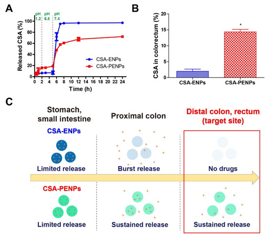 Drug release profiles of the CSA formulations in the gradually pH-changing media. (A) Drug release profiles of CSA-ENPs and CSA-PENPs. (B) Percentage of the released CSA in the simulated conditions of the colorectum. (C) Suggested mechanisms for enhanced oral CSA delivery to the distal colon. The results are expressed as mean ± standard deviation (n = 3, * p < 0.05 compared to the CSA-ENPs group).