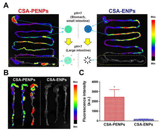 In vivo distribution of the CSA formulations at 15 h after oral administration. (A) Fluorescence images of the whole gastrointestinal tract. Yellow dotted rectangle indicates the large intestine. (B) Fluorescence images of the large intestine. (C) Fluorescence intensity of the large intestine. Data are expressed as mean ± standard deviation (n = 3, * p < 0.05 compared to the CSA-ENPs group).