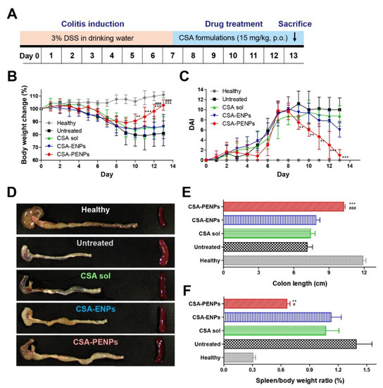 Colon length and spleen/body weight ratio were measured as parameters of colitis severity on day 13. Owing to severe inflammation, the colon length of the untreated group was shorter than that of healthy mice (Figure 5D,E). Treatment with the CSA solution or CSA-ENPs did not affect colon length, indicating that these treatments could not mitigate inflammatory reactions in the colon. However, after 6 days of treatment with CSA-PENPs, the colon length was significantly recovered compared to that of the CSA-ENP-treated and untreated group (p < 0.001), and displayed the potent anti-inflammatory effects provided by the targeted delivery of CSA to the colitis tissues. The enhanced anti-inflammatory effects of CSA-PENPs were also confirmed by the spleen/body weight ratio assessment. As shown in Figure 5F, the spleen/body weight ratio was markedly increased in the CSA solution, CSA-ENP-treated and untreated groups resulted from the severe inflammation. On the other hand, that of the CSA-PENP-treated group was significantly reduced compared to that of the untreated and CSA-ENP-treated groups (p < 0.001 and p < 0.05, respectively) due to the potent anti-inflammatory effects of the CSA-PENPs. Taken together, owing to the enhanced CSA accumulation in inflamed lesions in the distal colon via colitis-targeted delivery, CSA-PENPs exhibited potent anti-inflammatory effects.