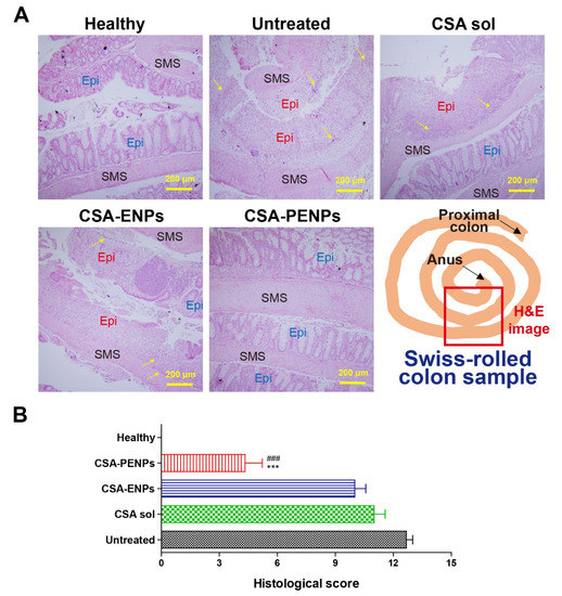 After macroscopic assessments, the enhanced anti-inflammatory effects of CSA-PENPs were examined via histological observation. By using the Swiss-roll method to prepare samples for H&E staining, multiple points of each colon could be observed; however, when the traditional method was employed, only one point of the colon could be observed [41]. As shown in Figure 6A, in the H&E images of the untreated colitis group, the broad area of the outermost lining (mucosa, colon epithelium) was severely damaged, but displayed normal morphology, including a well-differentiated epithelium structure, in the healthy images. In the CSA solution and CSA-ENP-treated groups, pathological histological morphologies, such as epithelial depletion, absence of goblet cells in the mucosa, and massive immune cell infiltration resulting from the presence of inflammation in the colon, were observed. In contrast, in the H&E image from the CSA-PENP-treated group, the signs of inflammation were remarkably decreased, resulting in the restoration of the colon epithelium and reduced immune cell infiltration. For semi-quantitative analysis of the histological assessments, histological scores were measured from the H&E images (Figure 6B). Owing to the extensive tissue damage over a large area, the untreated group had the highest histological score among the experimental groups. The CSA solution and CSA-ENP-treated groups also had similar histological scores, which slightly decreased owing to the presence of partially recovered areas. In the CSA-PENP-treated group, histological score was significantly decreased relative to that in the CSA-ENP-treated and untreated colitis groups (p < 0.001) owing to the enhanced tissue recovery. However, as the tissues were not completely restored and the damaged portions still existed, the histological score of the CSA-PENPs was approximately 3.5, which is higher than that of the healthy group. Collectively, based on the histological assessments, CSA-PENPs exhibited potent re-epithelialization effects by alleviating inflammatory reactions in the colon. As CSA-PENPs could deliver a sufficient amount of CSA to the target tissues, enhanced anti-inflammatory effects could be achieved.