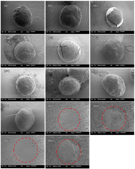 SEM images of (a) MCC and (b) XPVP pellets that were (i) uncompacted or compacted at (ii) 10, (iii) 20, (iv) 30, and (v) 40 MPa. Pellets still embedded in the surface of the MUPS tablet compacted at (vi) 30 and (vii) 40 MPa are encircled by a red dashed line.