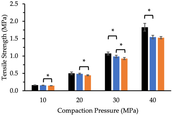 Tensile strength values (n = 5) of control tablets (∎) and MUPS tablets compacted at various compaction pressures containing MCC (∎) or XPVP pellets (∎). Error bars indicate the standard deviation and * denotes a significant (p < 0.05) difference.