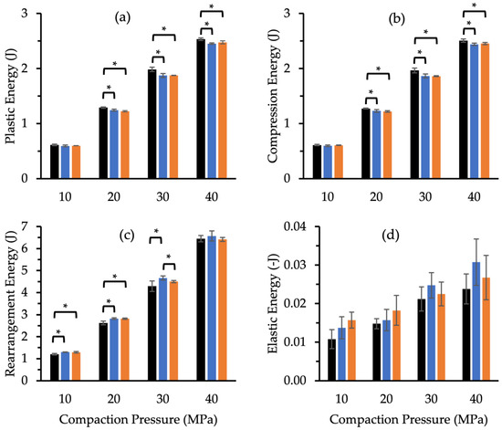Compaction energy data obtained from the Analis software for control tablets (∎) (n = 5) and MUPS tablets (n = 4) containing MCC (∎) or XPVP pellets (∎) compacted at various compaction pressures, comprising (a) plastic, (b) compression, (c) rearrangement, and (d) elastic energy. Error bars indicate the standard deviation and * denotes a significant (p < 0.05) difference.