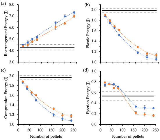 ) pellets contained in the MUPS tablet (n = 4). (a) Rearrangement energy, (b) plastic energy, (c) compression energy, and (d) ejection energy. Error bars represent the standard deviation. Trendlines (dotted) were fitted to discern trends. Control tablets (n = 5) acted as the baseline, and their compaction properties are indicated by a horizontal line (solid) with the bracketing as standard deviation lines (dashed).