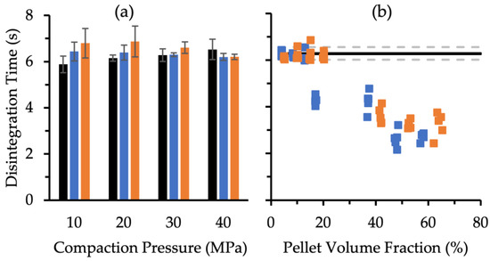 Tablets were prepared without pellets (control), with MCC pellets (15 mg in 200 mg tablet), and with XPVP pellets (15.5 mg in 200 mg tablet) at various compaction pressures and allowed to disintegrate, with the results depicted in Figure 5a. All disintegration times were below 8 s even at the highest compaction pressure of 40 MPa. The results show that the disintegration time of the MUPS tablets did not depend on the type of pellet core, as there was no significant difference between the disintegration times of tablets prepared with MCC or XPVP pellets at all four compaction pressures. Fitting trendlines to the results using the Tableau software revealed that the compaction pressure only increased the disintegration time significantly (p = 0.003) for the control tablets. The compaction pressure did not play a significant role in altering the disintegration time of MUPS tablets compacted with either MCC or XPVP pellets.