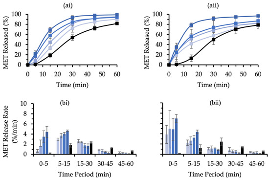 Another pellet coat damage indicator was the MET release rate, which was determined by measuring the difference in the amount of MET released (M) and dividing that difference by the corresponding change in time (T) according to the following equation: