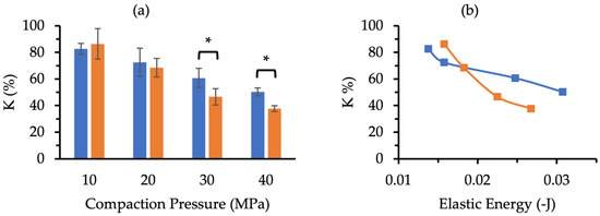 K values below 100% indicate an increase in drug release due to pellet coat damage. The K values (Figure 7a) demonstrate that both pellets experienced damage due to compaction. When compaction pressure was increased to 30 and 40 MPa, the XPVP pellets had significantly more coat damage than the MCC pellets. The pellet volume fraction in this evaluation was minimized to avoid risk factors that could affect pellet coat damage in MUPS tablets and thus could confound the direct effect of the compaction pressure. These risk factors include pellet–pellet interactions, pellet–tooling collisions, and pellet location [7]. The high R2 and low p values of the regression analysis support the validity of the models that describe the relationship of K with compaction pressure. The greater regression coefficient of the XPVP pellets indicates that the XPVP pellets experienced more damage per increase in compaction pressure. The MET release rate values (Figure 6b) further demonstrate that the XPVP pellet coat damage was generally higher and more variable. As more MET was released, the drug release rate consequently decreased and fell below that of corresponding uncompacted pellets, thus indicating a loss in sustained release function. The MET release rate results show that the MCC pellets retained more of the sustained release function than the XPVP pellets. The results also demonstrate that the XPVP pellets were more susceptible to damage with increased compaction pressure. Hence, altering the compaction pressure during the development of MUPS tablets would impart a greater effect on the pellet coat damage of XPVP pellets compared to MCC pellets.
