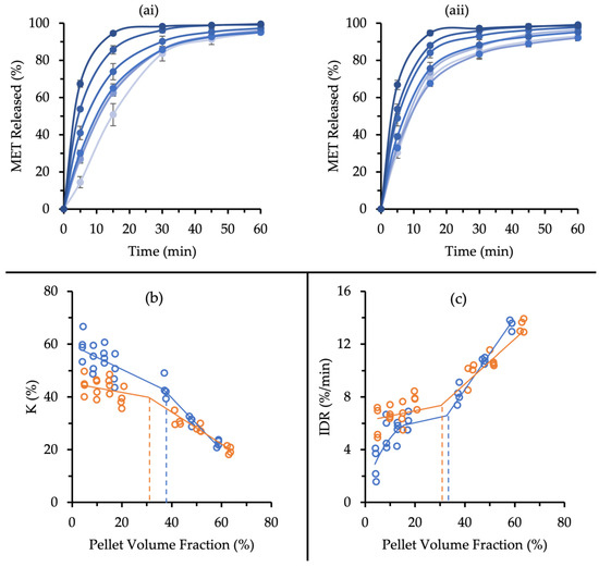 MUPS tablets inherently provide formulators with an opportunity to adjust the drug dosage by altering the pellet volume fraction. However, increasing the pellet volume fraction beyond a critical limit could adversely increase the probability and severity of pellet–pellet and pellet–tooling interactions during compaction [7,53]. This would potentially result in an undesired increase in pellet coat damage. Understandably, high-performing pellets would be able to resist coat damage at higher pellet volume fractions. In this regard, MCC and XPVP pellets were compared by preparing MUPS tablets of different pellet volume fractions ranging from 5% to 65%. The dissolution profiles demonstrate that increased pellet volume fractions resulted in faster MET release due to pellet coat damage. As seen in Figure 8, the XPVP pellets generally had more pellet coat damage than the MCC pellets across the pellet volume fraction range. It was apparent that at equivalent pellet volume fraction levels (i.e., levels I to VII), the actual pellet volume fraction was slightly different between the two pellet types. This suggests that the physical nature of the pellet influenced the degree of tablet compression, with the XPVP pellets resulting in greater overall material compression, potentially because of their weaker nature, which permitted further pellet and tablet deformation. Additionally, the critical pellet volume fractions were approximated for the MCC and XPVP pellets. The MCC pellets appeared to have a higher critical pellet volume fraction (~38%) compared to XPVP pellets (~30%). Collectively, the results demonstrate that the XPVP pellets were more susceptible to pellet coat damage than MCC pellets when more pellets were incorporated into the MUPS tablet. Therefore, the formulation of MUPS tablets with high pellet volume fractions favors the use of MCC as a spheronization aid.