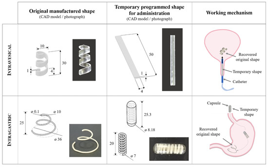 Depending on the organs involved and the administration mode, different retention mechanisms have been described over the years, such as low-density floatation, high-density sinking, and bioadhesion [6,7,8]. However, when dealing with hollow organs having challenging access through relatively small ducts for the inflow and outflow of biological fluids and containing highly variable amounts of liquids, the strategy based on expansion at the target site was proved especially effective [9]. It entails the use of shapes/sizes that would ensure easy administration of the system, while the subsequent size increase, leading to a bulkier configuration, would make its retention possible. In this respect, swelling and unfolding phenomena have been exploited. The latter may rely on either mechanical/elastic/superelastic deployment or on shape memory, which consists of untethered shape modifications triggered by an external non-mechanical stimulus, such as a change in temperature, moisture, or light [6,10,11,12,13,14,15,16]. Among shape memory polymers (SMPs), pharmaceutical-grade poly(vinyl alcohol) (PVA) has recently been used for the manufacturing of prototypes able to be programmed into space-saving temporary shapes and, upon contact with aqueous media at body temperature, recover the bulky original shapes attained through the production process [17,18]. Due to its well-known safety profile and swelling behavior followed by erosion/dissolution in aqueous media, PVA was selected for the development of DDSs to be retained in the urinary bladder or in the stomach. The ability of such systems to maintain the recovered original shape for a prolonged period of time would depend on their geometry, micro-structure, and composition on one hand, and on the motility of the target muscular organ on the other. Therefore, prototypes having different original shapes were fabricated by hot melt extrusion (HME) and fused deposition modeling (FDM). These techniques were chosen in view of the geometric versatility they would ensure and the possibility of processing materials having diverse properties [19,20,21,22,23,24,25,26,27]. Moreover, 3D printing of a shape memory polymer of pharmaceutical-grade resulted in one of the first applications of 4D printing in pharmaceutics [28,29,30,31,32]. Figure 1 summarizes: (i) original shapes obtained by the manufacturing process, (ii) temporary shapes programmed under appropriate thermo-mechanical protocols, and (iii) possible intravesical as well as intragastric applications of these SMP-based expandable DDSs. The original shapes given under fabrication (e.g., U-, I-, helical-, and S-shape) were designed with a spatial encumbrance suitable for long-lasting residence in the target organ, specifically to avoid early emptying of the DDS and the risk of occlusion of the urethra or the pylorus. On the other hand, the temporary shapes (e.g., I and supercoiled) were conceived for administration through the selected routes (i.e., insertion into the urinary bladder via a catheter or oral intake inside a commercially available hard-gelatin capsule) and achieved by manual deformation. A comprehensive pool of data was obtained from PVA-based samples under various experimental conditions (e.g., volume and type of fluids, temperature, presence of external constraints) [33,34]. Such data were then used to calibrate and validate a mathematical model intended to ease further development of the expandable DDSs allowing for the screening of a broad range of possible compositions and geometries.