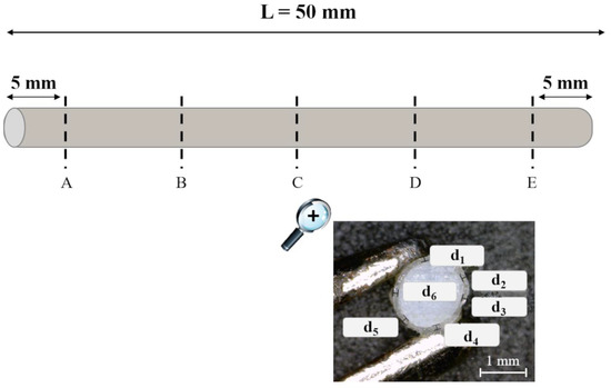 Coated samples (n = 6) were cut at 5 equally spaced positions (A–E) along their length, starting 5 mm away from the ends of the specimen (Figure 2). For each cross-section, the coating thickness was measured at 6 different points (d1–d6) along the circumference. Photographs of the cross-sections were acquired using a digital microscope (Digital Microscope AM-413T, Dino-Lite, Milan, Italy; resolution = 1.3 Megapixel − 1280 × 1024) and processed by an image-analysis software (ImageJ, Milan, Italy).