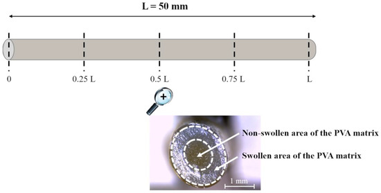 Hydrated/swollen samples were cut into 4 equal segments, so that their cross-sections could be observed and photographed under the microscope (Leica DMS300, Leica, Munich, Germany) at 5 equally spaced positions along their longitudinal axis, i.e., the two uncoated surfaces (0 and L positions) and the 3 internal positions expressed as fractions of the total length (L) of the specimen (0.25L, 0.5L, and 0.75L, respectively) (Figure 3). The typical appearance of a cross-section is also reported in Figure 3, showing a clearly distinguished swollen area (translucent part of the cross-section) and a non-swollen area (opaque), separated by dashed lines. The circumference of the non-swollen area highlighted in Figure 3, separating the rubbery region that has already interacted with water from the merely glassy portion that has not yet hydrated, corresponds to the swelling front. The area of the swollen and the non-swollen portions of the PVA matrix (excluding the coating layer in the coated samples) was measured by means of the above-mentioned image analysis software. For each timm considered, a different specimen was employed.