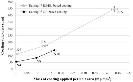 As expected, longer process times led to increasing coating thicknesses (Table 3). Notably, the greatest variability in thickness (CV in the 12–16 range) was found for N4 samples having a < 50 μm thick Eudragit® NE coating. CV values relevant to all the other coated prototypes were much lower, indicating that a reproducible process was set up. The growth trend of thickness versus mass per unit area of the coating applied was quite similar for the two formulations considered (Figure 4). However, the thickness achieved in the same process time turned out lower when dealing with the Eudragit® NE aqueous suspension. Indeed, as water required longer evaporation times, the spray rate of the Eudragit® NE formulation needed to be decreased to avoid swelling/dissolution of the underlying PVA matrix.