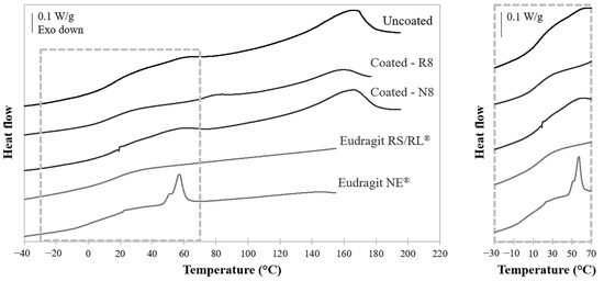 Thermograms of uncoated and coated (i.e., R8 and N8) samples, and of free Eudragit® RS/RL and Eudragit® NE films; the insert is a magnification of the glass transition regions.