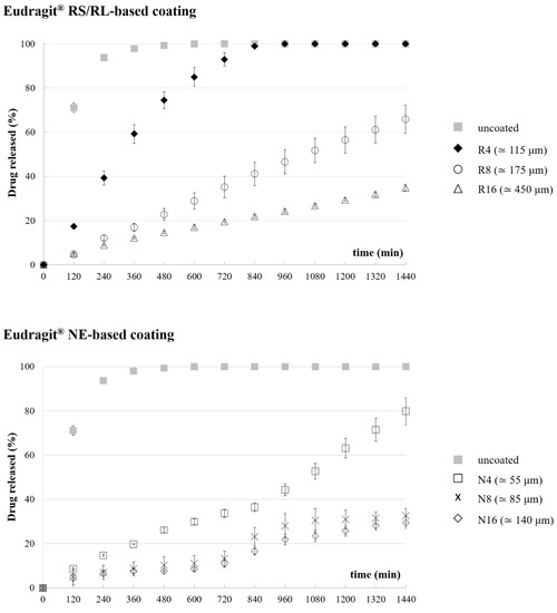 - ₋ timm for samples coated with Eudragit® NE = 10 min, 30 min, 1 h, 4 h, 6 h, 10 h, and 24 h.