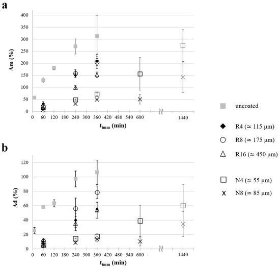A consistent behavior was observed in terms of mean diameter increase, as highlighted in Figure 7b. Indeed, as a consequence of water uptake, the sample diameter tended to increase, with greater Δd values for longer immersion times, thinner coatings, and more permeable coating formulations.