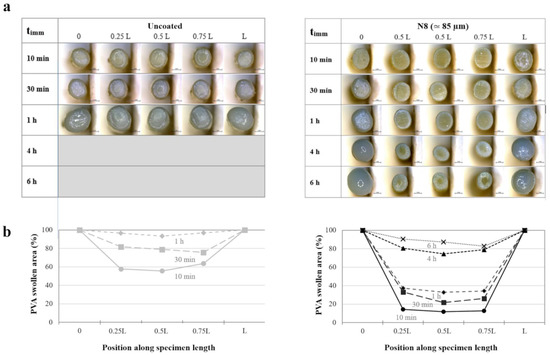 Due to the peculiar configuration of the samples (i.e., presence of uncoated ends), aqueous fluid penetration was supposed to proceed at different rates along their longitudinal and radial axes, which might impact on the overall swelling behavior of the PVA-based core. Therefore, it was interesting to observe different cross-sections of uncoated and coated prototypes (i.e., surfaces cut at diverse positions along the specimen length) at increasing timm. The selected positions were the uncoated ends and 3 equally spaced inner points (i.e., 0 and L versus 0.25L, 0.5L, 0.75L, as indicated in Figure 3). By way of example, Figure 8 shows photographs of the cross-sections of an uncoated specimen and a coated N8 one at increasing timm, together with profiles describing the swollen PVA area along the longitudinal axis of the samples.
