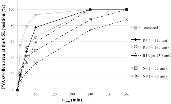 Overall, the images suggested the presence of a swelling front in the PVA matrix moving in the radial direction as a function of timm. Notably, for both uncoated and coated specimens, the ends were rapidly fully swollen. Conversely, at the 0.25 L, 0.5 L, and 0.75 L positions, the polymer was only partially swollen, with the swollen area increasing at different rates for uncoated and coated samples. To better highlight the effect of the various coatings, the percentage swollen area in the cross-section corresponding to the center of the specimens (i.e., 0.5L) was considered (Figure 9). This representation was helpful to confirm that the time required for water to penetrate through the entire cross-section depended on the type and thickness of the applied coating. Indeed, by comparing samples coated with the same formulation, it was evident that a thicker coating would result in a reduced swelling rate.