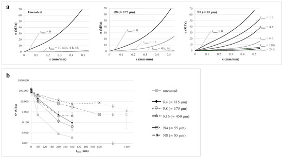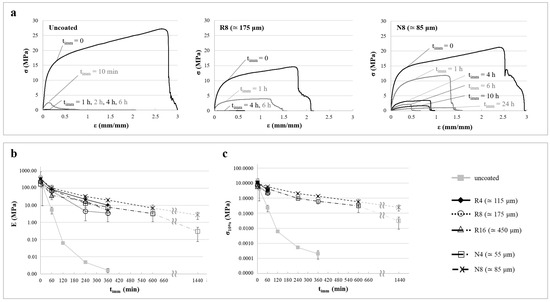 (a) Stress versus strain curves relevant to uncoated, R8, and N8 specimens tested under tensile conditions after different immersion times, and profiles of (b) E as well as of (c) σ10% as a function of immersion time.