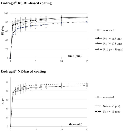 - ₋ timm for samples coated with Eudragit® RS/RL = 10 min, 30 min, 1 h, 4 h, and 6 h;