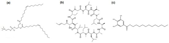 Structure of 1,2-dioleoyl-sn-glycero-3-phosphocholine, DOPC (a), cyclosporine A, CsA (b), and lauryl gallate, LG (c).