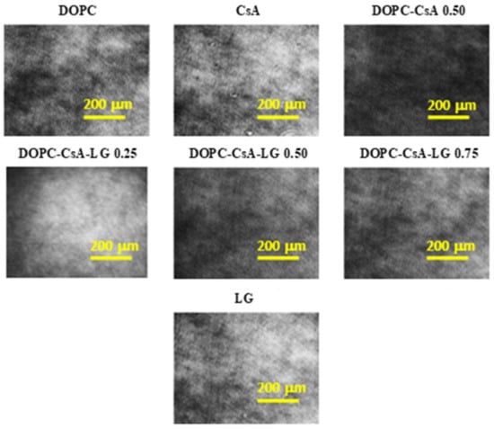 In order to investigate the morphology of all studied monolayers on the water subphase, BAM images were taken (Figure 2). During the compression no phase separation was observed in the entire range of surface pressures, i.e., homogeneous films were obtained. Figure 2 presents only the representative BAM images taken at a surface pressure of 10 mN m−1. This is in agreement with the miscibility of DOPC-CsA-LG monolayer components described previously [41].